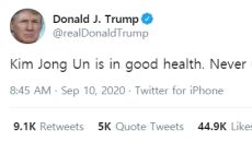 도널드 트럼프 미국 대통령이 10일(현지시간) “김정은은 건강하다. 절대 그를 과소평가하지 마라”는 트윗을 별 다른 언급 없이- 2020.09.10 23:22