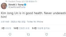 도널드 트럼프 미국 대통령이 현지 시간으로 10일, 자신의 트위터 계정에 "김정은은 건강하다. 절대 그를 과소평가하지 마라"는- 2020.09.10 23:17