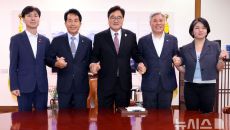 [서울=뉴시스] 이창환 기자 = 조국혁신당과 진보당, 기본소득당, 사회민주당은 16일 우원식 국회의장을 만나 교섭단체 기준 완- 2025.07.16 17:20