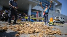 '용담댐 방류 침수 피해' 주민들, 썩은 과일 뿌리며 "피해 보상하라"