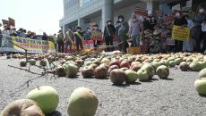'용담댐 방류 침수피해' 주민들, 썩은 과일 뿌리며 수공에 항의