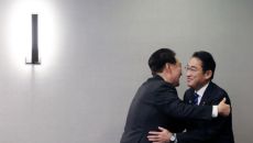 한·일 정상, 포옹하며 우정 과시…尹 "양국 협의체 100% 복원"