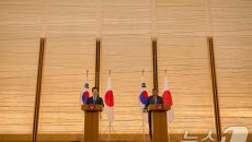 [도쿄 로이터=뉴스핌] 이재명 대통령이 23일 일본 도쿄 총리 관저에서 이시바 시게루 일본 총리와 공동언론발표를 위해 입장하고- 2025.08.23 21:50