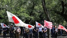 야스쿠니신사에서 펄럭이는 욱일기 / 사진=연합뉴스 태평양전쟁 전범이 합사된 야스쿠니신사에 이시바 시게루 일본 총리가 공물 대금- 2025.08.16 14:36