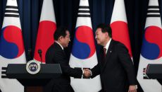 [서울=뉴스핌] 윤석열 대통령과 기시다 후미오 일본 총리가 7일 용산 대통령실 청사에서 열린 공동 기자회견에서 악수를 하고 있- 2023.05.08 07:34