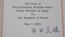 기시다 후미오 총리가 7일 서울 동작구 국립서울현충원 방명록의 ‘일본 총리의 대한민국 방문’ 영문 문구에 서명했다. 기시다 총- 2023.05.07 15:40