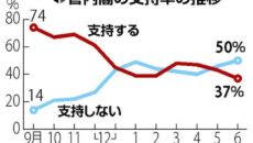 요미우리 조사, 9월 출범 때의 '반토막' 올림픽 강행에 대한 불안감 반영된 듯 올림픽 개최(50%) > 반대(48%)로 역전- 2021.06.07 10:38