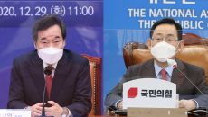 (서울=연합뉴스) 이유미 김동호 기자 = 더불어민주당의 대권주자 양강인 이낙연 대표와 이재명 경기지사가 나란히 '검찰개혁' 기- 2020.12.29 13:51
