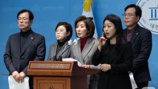 (서울=뉴스1) 이재명 기자 = 국민의힘 나경원 의원를 비롯한 이만희, 김정재, 송언석 의원이 16일 오후 서울 여의도 국회- 2025.01.16 14:07