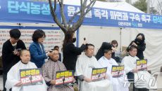 (전주=뉴스1) 유경석 기자 = 더민주전북혁신회의 관계자들이 12일 전북 전주시 전북특별자치도청 앞 단식농성장에서 '윤석열 즉- 2025.03.12 11:48