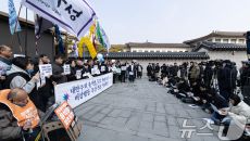 [서울=뉴스핌] 이길동기자= 윤석열즉각퇴진·사회대개혁 비상행동 관계자들이 9일 서울 종로구 경복궁 인근 서십자각 앞에서 '윤석- 2025.03.09 13:47