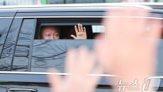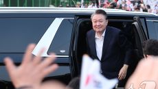 지지자들에게 인사하기 위해 하차하는 윤석열 대통령