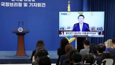 (서울=뉴스1) 송원영 기자 = 29일 서울 용산 대통령실청사 브리핑룸에서 취재진들이 윤석열 대통령의 국정브리핑을 모니터를 통- 2024.08.29 13:48