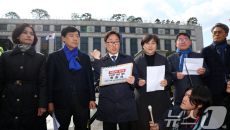 (서울=뉴스1) 김명섭 기자 = 국회 법사위 야당 위원들이 18일 오후 서울 종로구 헌법재판소에서 피청구인 윤석열 파면 촉구- 2025.03.18 15:30