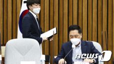 [서울=뉴스핌] 이형석 기자 = 이준석 국민의힘 대표(왼쪽)와 김성원 국민의힘 경기도당위원장이 22일 서울 여의도 국회에서 열- 2022.03.22 12:12