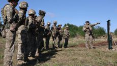 부서진 건물 앞에 병사들이 러시아 국기와 군부대 깃발을 편 채 서 있습니다. 러시아군은 우크라이나 중남부의 드니프로페트로프스크- 2025.08.27 13:58