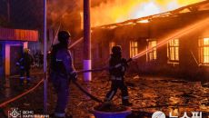2일 공개된 사진으로 러시아 드론 공격을 받아 화재가 발생한 우크라이나 하루키우에서 소방관들이 진화 작업을 벌이고 있다. [사- 2025.07.02 16:29