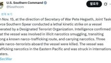 [서울=뉴스핌] 최원진 기자= 미군이 또다시 마약 운반에 연루된 것으로 보이는 선박을 격침했다. 미군 남부사령부는 16일(현지- 2025.11.17 08:19