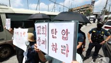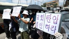 압수수색에 교회 탄압 중지 시위하는 신도들