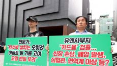 [서울=뉴스핌] 정일구 기자 = 환경단체 푸른마을 지킴이 관계자들이 3일 오전 서울 강남구 더파크사이드 서울 갤러리 앞에서 용- 2025.07.03 12:41
