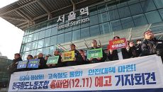 ▲ 전국철도노동조합(철도노조) 조합원들이 2일 서울역 광장에서 총파업 예고 기자회견을 열고 있다. 전국철도노동조합(철도노조)이- 2025.12.02 11:50