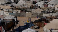 ▲ 현지시간 20일 가자지구에 설치된 임시텐트 캠프에 이스라엘 작전 중 피난민이 된 팔레스타인들이 서 있다. 팔레스타인 무장정- 2025.09.21 03:22