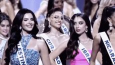 (서울=연합뉴스) 태국에서 열리고 있는 미스 유니버스 2025 행사 무대에 나란히 선 미스 팔레스타인과 미스 이스라엘. 분홍색- 2025.11.13 16:46
