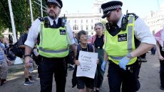 ▲ 현지시간 9일 런던 웨스트민스터 의회광장에서 '팔레스타인 액션' 금지 해제를 요구하는 집단 시위 중 경찰에 의해 한 여성이- 2025.08.10 05:07