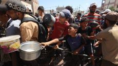 ▲ 가자지구 남부 칸유니스 구호소 물탱크 트럭 앞에 물을 받으려고 모인 팔레스타인 주민들 가자지구에서 벌어지고 있는 팔레스타인- 2025.07.25 05:37