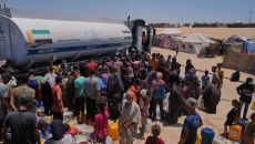 ▲ 지난 19일(현지시간) 가자지구 남부 칸유니스 구호소 물탱크 트럭 앞에 물을 받으려고 모인 팔레스타인 주민들 가자지구에서- 2025.07.21 11:16