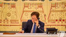 (서울=뉴스1) 이재명 기자 = 이재명 대통령이 지난 28일 서울 한남동 관저에서 라흐몬 타지키스탄 대통령과 통화를 하고 있다- 2025.08.29 11:26
