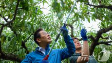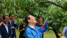 (서울=뉴스1) 허경 기자 = 이재명 대통령이 16일 세종시 전동면 조일농원 복숭아 농장을 방문해 가지치기 체험을 하고 있다.- 2025.09.16 20:10