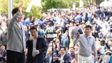 손 흔들며 무대 오르는 이재명