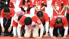[대구=뉴스핌] 최지환 기자 = 김문수 국민의힘 대선후보가 12일 오후 대구 중구 서문시장에서 열린 유세에서 시민들에게 큰 절- 2025.05.12 19:09