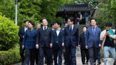 남해 충렬사 나서는 이재명 대선후보
