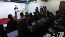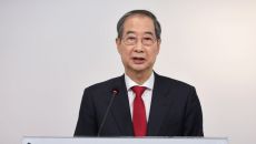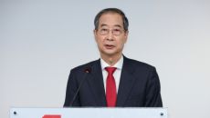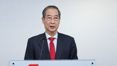 붉은 넥타이 매고 기자회견하는 한덕수