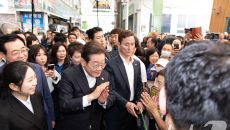 (의령=뉴스1) 이재명 기자 = 경청투어에 나선 이재명 더불어민주당 대통령 후보가 10일 오전 경남 의령군 의령읍 의령전통시장- 2025.05.10 14:06