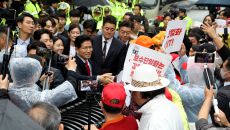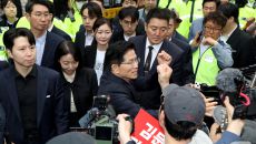 김문수 후보, 당사 앞 모인 지지자들과 악수