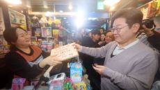 (성주=뉴스1) 이재명 기자 = 3차 경청투어에 나선 이재명 더불어민주당 대통령 후보가 9일 오후 경북 성주군 성주전통시장에서- 2025.05.09 17:55