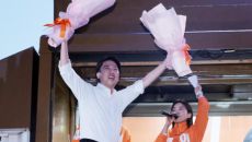 [서울=뉴스핌] 이길동 기자 =이준석 개혁신당 대선후보가 12일 오후 서울 중구 청계광장에서 열린 출정식에서 꽃다발을 들고 시- 2025.05.12 21:59