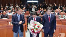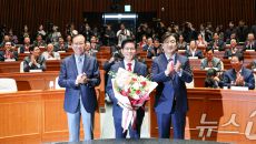 (서울=뉴스1) 안은나 기자 = 김문수 국민의힘 대통령 후보가 9일 서울 여의도 국회에서 열린 의원총회에서 꽃다발을 받은 뒤- 2025.05.09 15:17