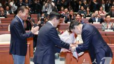 (서울=뉴스1) 안은나 기자 = 김문수 국민의힘 대통령 후보가 9일 서울 여의도 국회에서 열린 의원총회에서 꽃다발을 받고 있다- 2025.05.09 15:15