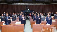 (서울=뉴스1) 안은나 기자 = 김문수 국민의힘 대통령 후보가 9일 서울 여의도 국회에서 열린 의원총회에서 국민의례를 하고있다- 2025.05.09 15:15
