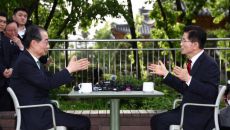 [이데일리 방인권 기자] 김문수 국민의힘 대선 후보가 8일 서울 여의도 국회 사랑재의 한 카페에서 무소속 한덕수 대선 예비후보- 2025.05.08 18:27