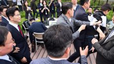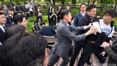 김문수 후보 항의 중 저지되는 한덕수 후보 지지자