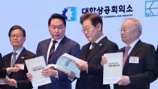 이재명 더불어민주당 대선후보가 8일 오전 서울 중구 대한상공회의소에서 열린 대선후보 초청 경제5단체장 간담회에서 정첵 제언집을- 2025.05.08 12:17
