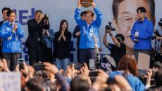 지지자들에게 인사하는 이재명 더불어민주당 대통령 후보