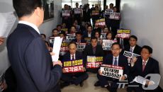 민주당 의원 앞 규탄 피켓 든 국민의힘