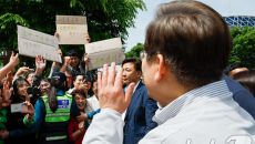 '공판연기 환영' 지지자 향해 인사하는 이재명 후보