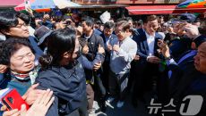 (진안=뉴스1) 안은나 기자 = 정은경 더불어민주당 총괄선대위원장이 7일 오전 전북 진안군 진무로를 찾아 이재명 대통령 후보- 2025.05.07 11:05